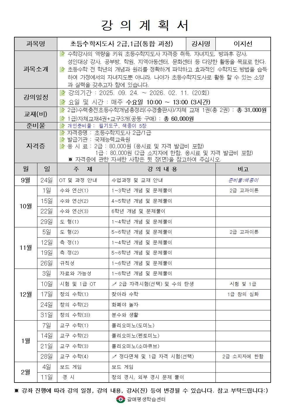 ● 수학강사의 역량을 키워 초등수학지도사 자격증 취득, 자녀지도, 방과후 강사, 성인대상 강사, 공부방, 학원, 지역아동센터, 문화센터 등 다양한 활동을 목표로 한다. ● 초등수학 전 학년의 개념과 원리를 정확하게 파악하고 효과적인 수학지도 방법을 습득하여 가정에서의 자녀지도뿐 아니라, 나아가 초등수학지도사로 활동 할 수 있는 소양과 실력을 갖추고자 함에 있습니다. ★ 해당 강좌 수강 시 "필기도구, 색종이 5장" 준비 부탁 드립니다. ★ 교재비 및 자격증 응시료 별도 (※ 2급 자격증 미소지 시, 1급 자격증 취득 불가) ★ 학습 전 유의사항(강의계획서) 참고
