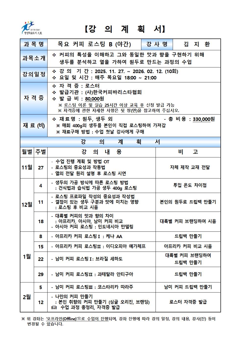 ★ 커피의 특성을 이해하고 그와 동일한 맛과 향을 구현하기 위해 생두를 분석하고 열을 가하여 원두로 만드는 과정의 수업 ★ 재료명 : 원두, 생두 외 - 총 비용 : 330,000원 ※ 매회 400g의 생두를 본인이 직접 로스팅하여 가져감 ※ 재료구매 방법 : 수업 첫날 강사에게 구매 ▶ 과목에 따라 "사전준비물(재료, 교재 등)"이 있을 수 있으니 반드시 하단의 『강의계획서』를 참고해 주세요 !