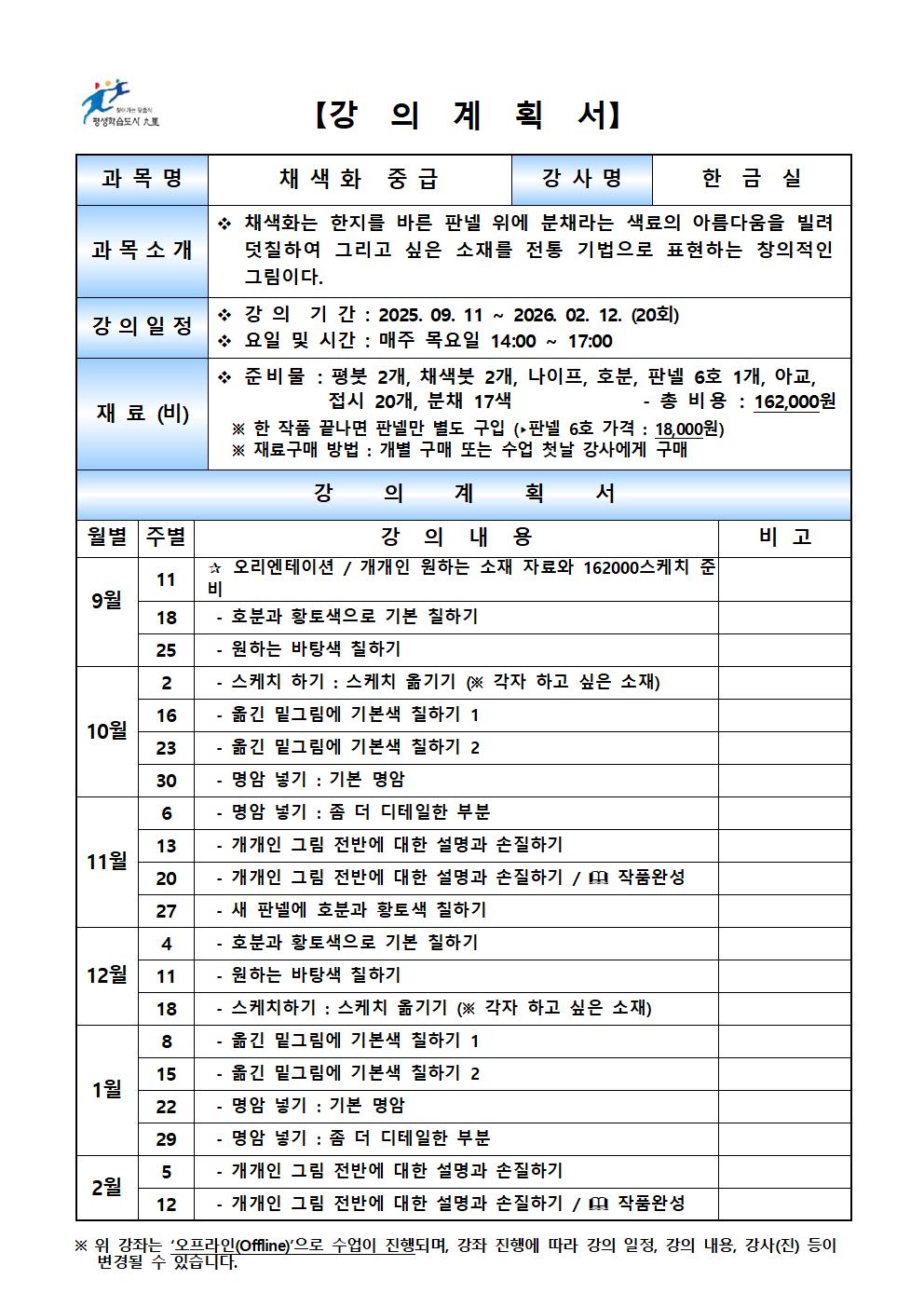 3. 수강 신청 인원이 기준(정원 50%미만)에 미달 될 경우 폐강 될 수 있으며, 폐강시 수강료는 전액 환불됩니다.