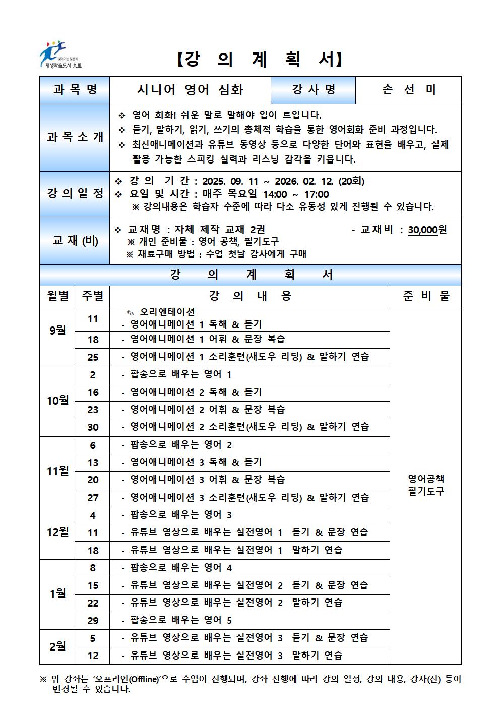★ 영어 회화! 쉬운 말로 말해야 입이 트입니다. ★ 듣기, 말하기, 읽기, 쓰기의 총체적 학습을 통한 영어회화 준비 과정입니다. ★ 최신애니메이션과 유튜브 동영상 등으로 다양한 단어와 표현을 배우고, 실제활용 가능한 스피킹 실력과 리스닝 감각을 키웁니다. ※ 본 강좌는 기초영어과정 중 심화과정으로 영어회화를 위한 준비 과정입니다! ★ 개인 준비물 : 영어 공책, 필기도구 ※ 재료구매 방법 : 수업 첫날 강사에게 구매 ▶ 과목에 따라 "사전준비물(재료, 교재 등)"이 있을 수 있으니 반드시 하단의 『강의계획서』를 참고해 주세요 !