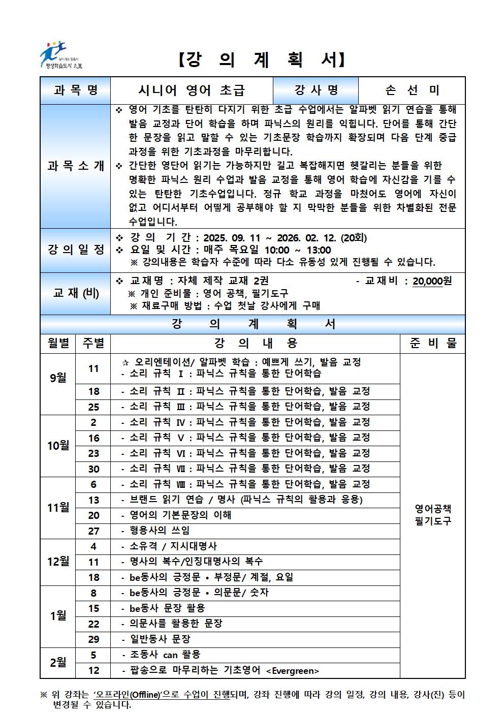 ★ 영어 기초를 탄탄히 다지기 위한 초급 수업에서는 알파벳 읽기 연습을 통해 발음 교정과 단어 학습을 하며 파닉스의 원리를 익힙니다. 단어를 통해 간단한 문장을 읽고 말할 수 있는 기초문장 학습까지 확장되며 다음 단계 중급 과정을 위한 기초과정을 마무리합니다 ★ 간단한 영단어 읽기는 가능하지만 길고 복잡해지면 헷갈리는 분들을 위한 명확한 파닉스 원리 수업과 발음 교정을 통해 영어 학습에 자신감을 기를 수 있는 탄탄한 기초수업입니다. 정규 학교 과정을 마쳤어도 영어에 자신이 없고 어디서부터 어떻게 공부해야 할 지 막막한 분들을 위한 차별화된 전문 수업입니다. ▶ 과목에 따라 "사전준비물(재료, 교재 등)"이 있을 수 있으니 반드시 하단의 『강의계획서』를 참고해 주세요 !
