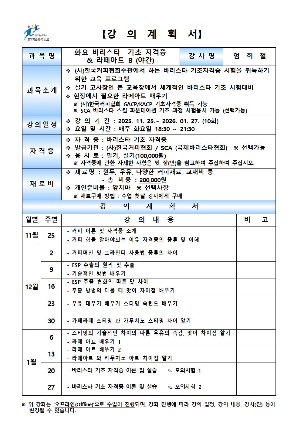 ★ (사)한국커피협회주관에서 하는 바리스타 기초자격증 시험을 취득하기 위한 교육 프로그램 ★ 실기 고사장인 본 교육장에서 체계적인 바리스타 기초 시험대비 ★ 현장에서 필요한 라떼아트 배우기 ※ (사)한국커피협회 GACP/KACP 기초자격증 취득 가능 ※ SCA 바리스타 스킬 파운데이션 기초 과정 시험응시 가능 (선택가능) ※ '외부교육장' 수업 프로그램 ▶ 과목에 따라 사전준비물(재료, 교재 등)이 있을 수 있으니 반드시 하단의 강의계획서를 참고해 주세요 !