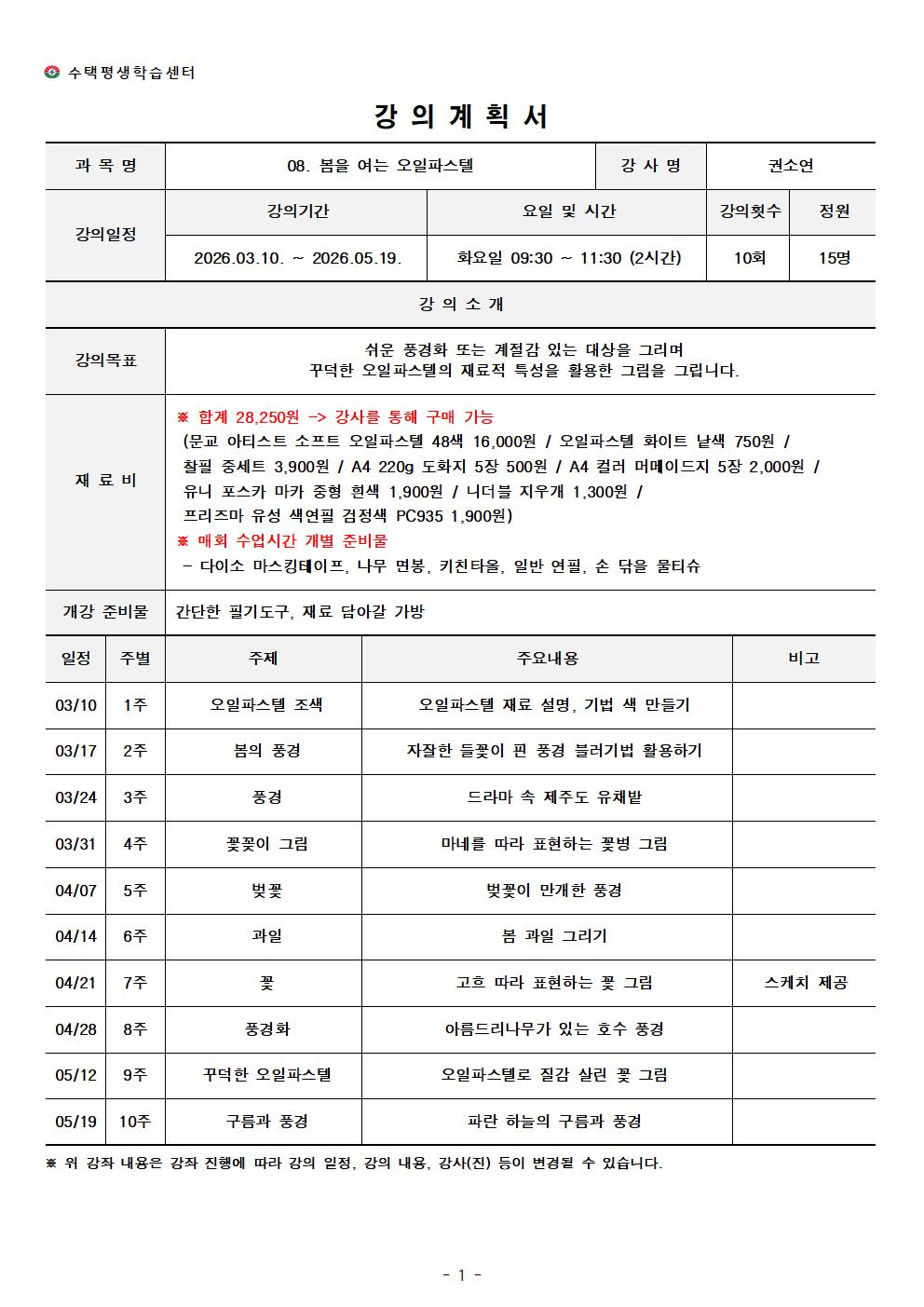 4. 재료비 및 교재비는 강사님께 직접 개별 납부하며 추후 변동 될 수 있습니다.