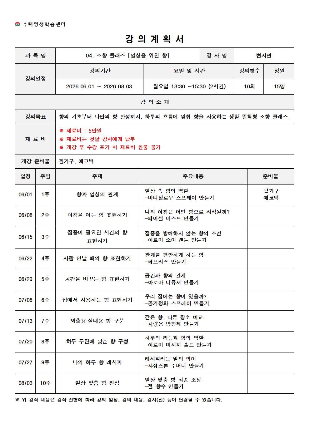 📌 향의 기초부터 나만의 향 완성까지 생활 밀착형 조향 클래스 ‼️ 재료비 및 준비물 필수 확인 🍀 자세한 사항은 「강의계획서」를 참고해 주시기 바랍니다.