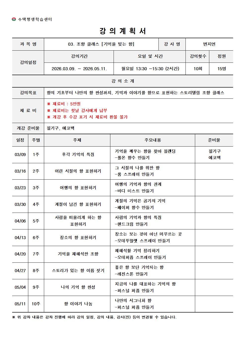 📌 향의 기초부터 나만의 향 완성까지, 기억과 이야기를 향으로 표현하는 스토리텔링 조향 클래스 ‼️ 재료비 및 준비물 필수 확인 🍀 자세한 사항은 「강의계획서」를 참고해 주시기 바랍니다.