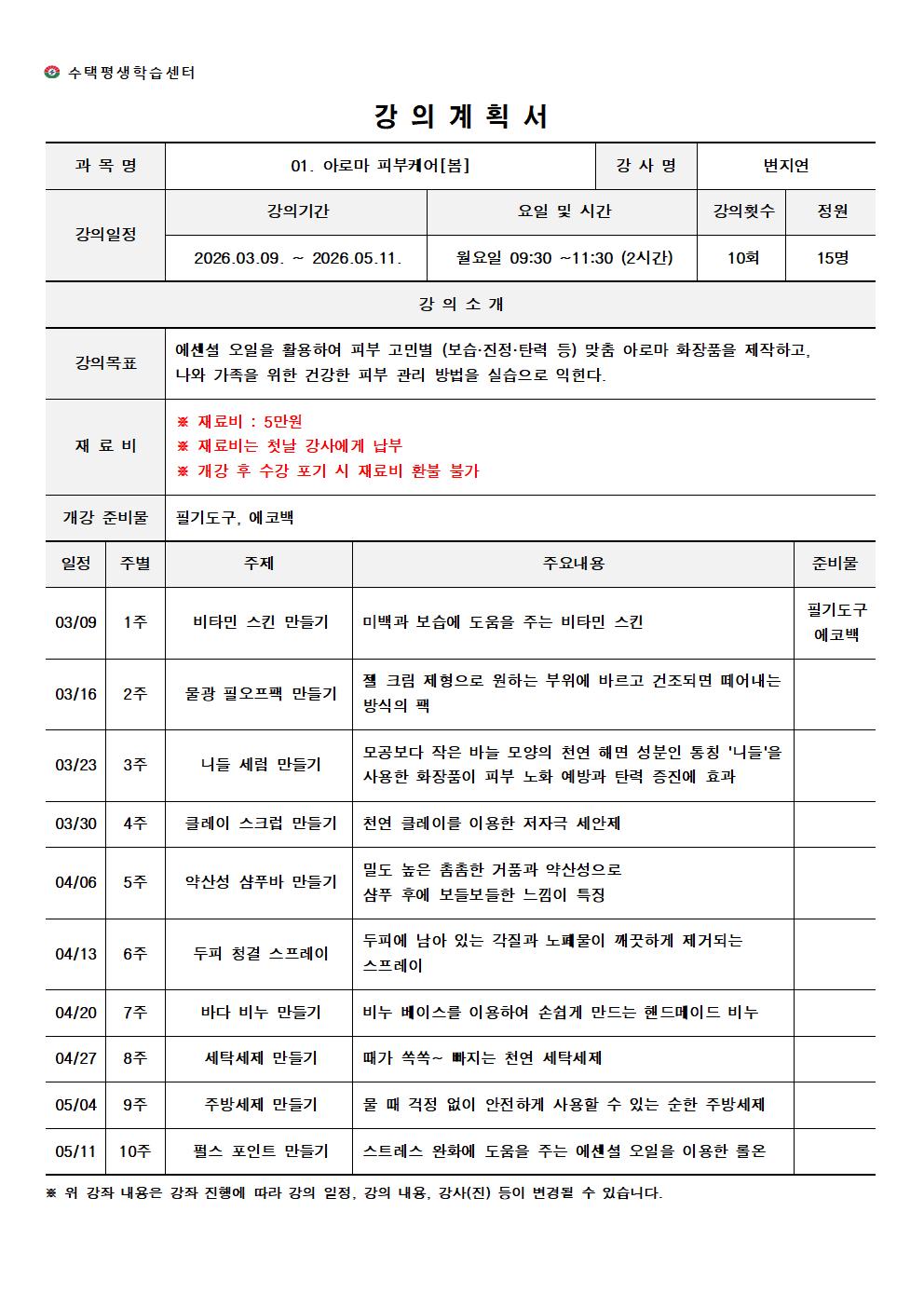 📌 에센셜 오일을 활용하여 피부 고민별 맞춤 아로마 화장품 제작하기 ‼️ 재료비 및 준비물 필수 확인 🍀 자세한 사항은 「강의계획서」를 참고해 주시기 바랍니다.