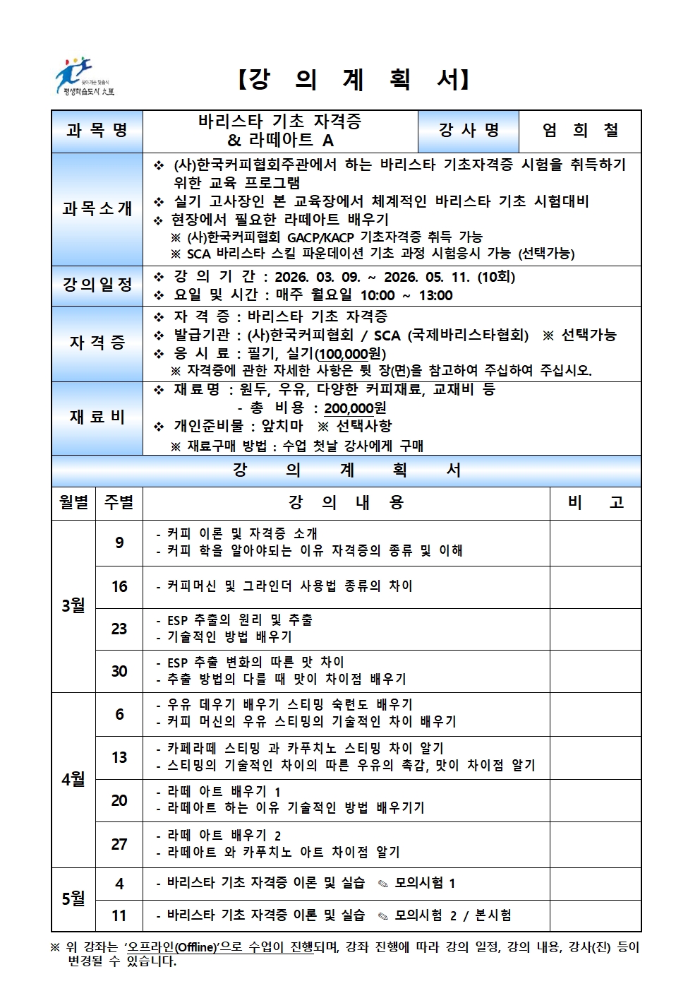 4. 재료비 및 교재비는 강사님께 직접 개별 납부하며 추후 변동 될 수 있습니다.